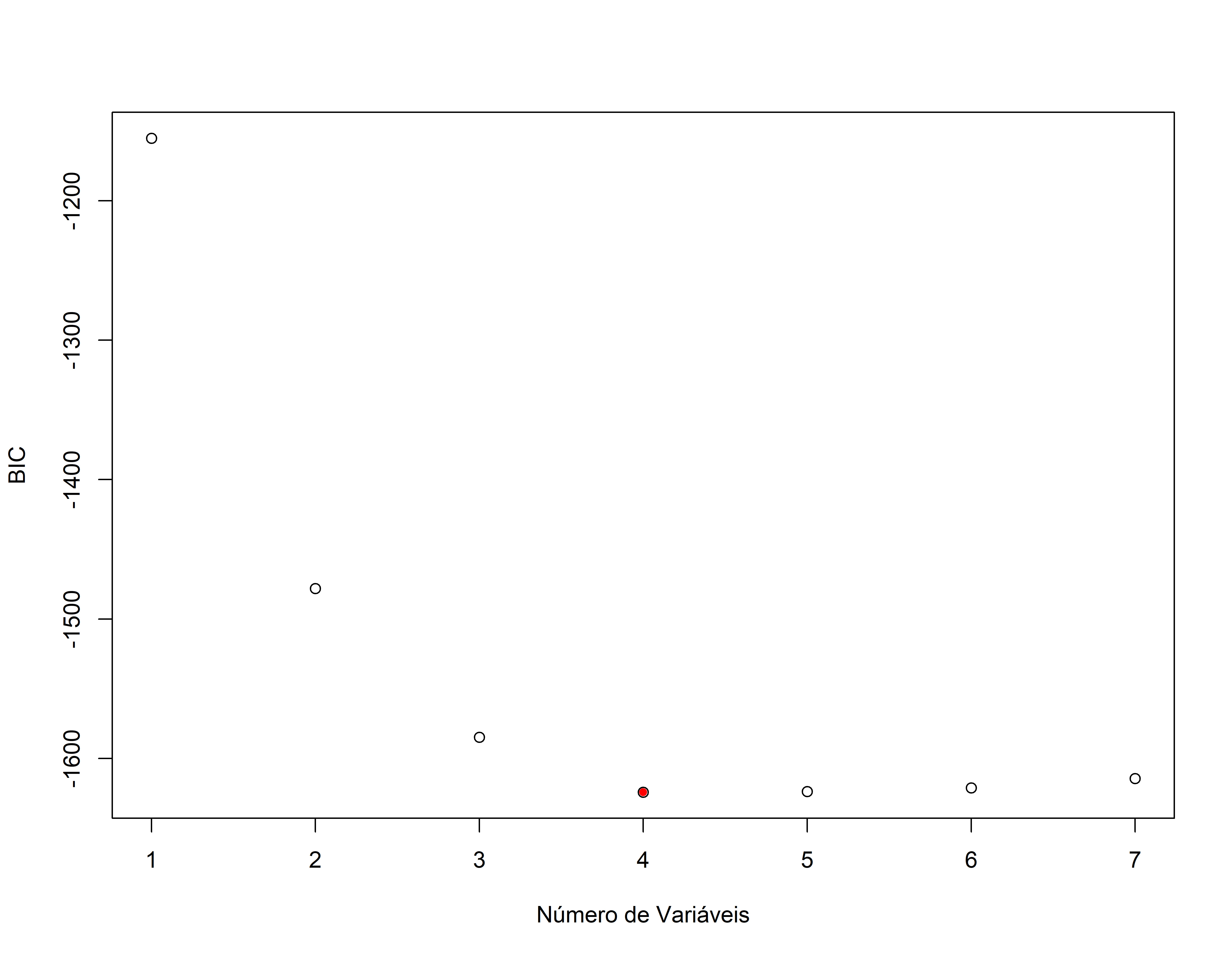 plot(sumario.reg$bic,xlab="Número de Variáveis",ylab="BIC")points(which.min(sumario.reg$bic),sumario.reg$bic[which.min(sumario.reg$bic)],pch=20,col="red")