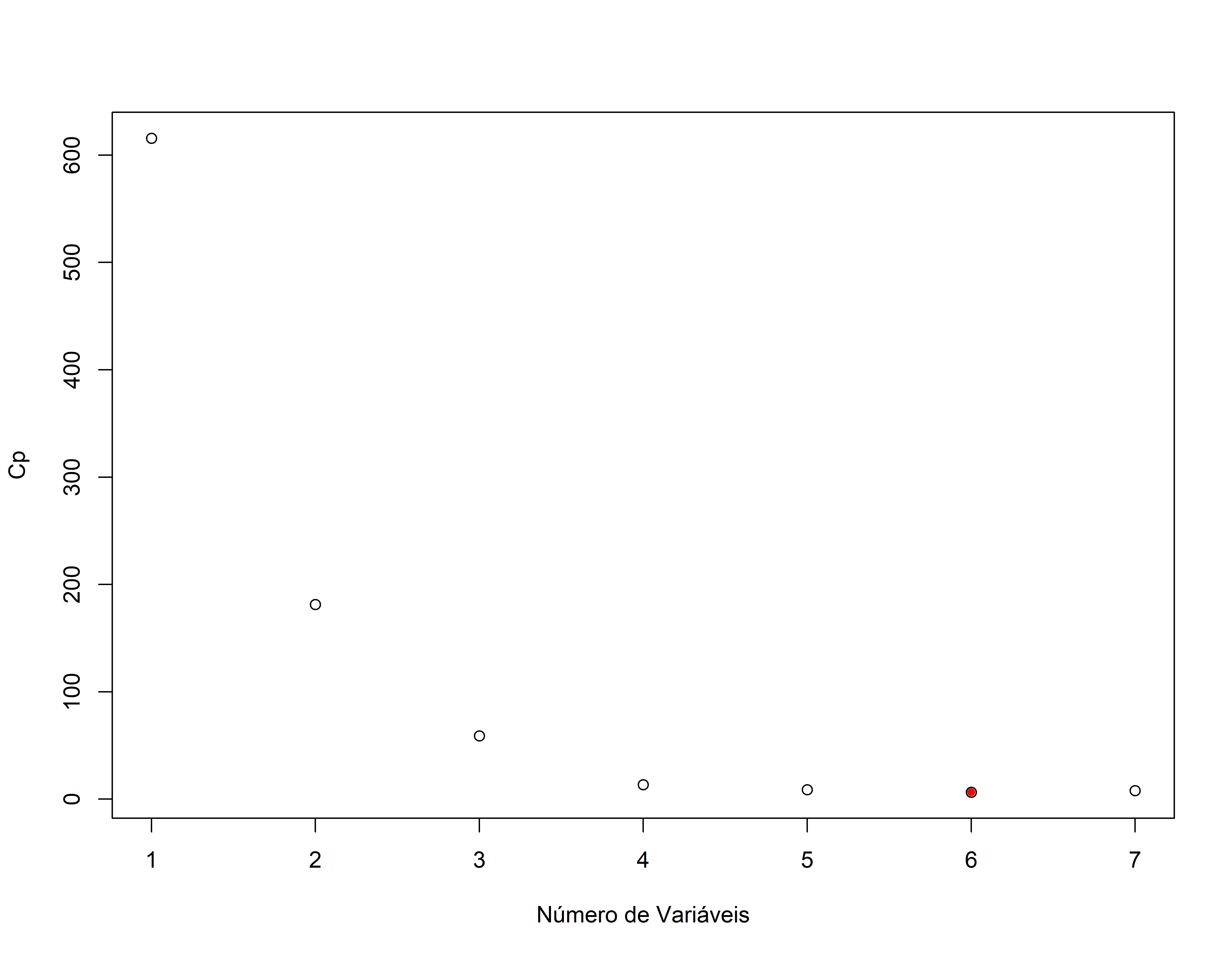 ## Os modelos vão ser escolhidos com base no menor Cpplot(sumario.reg$cp,xlab="Número de Variáveis",ylab="Cp")points(which.min(sumario.reg$cp),sumario.reg$cp[which.min(sumario.reg$cp)],pch=20,col="red")