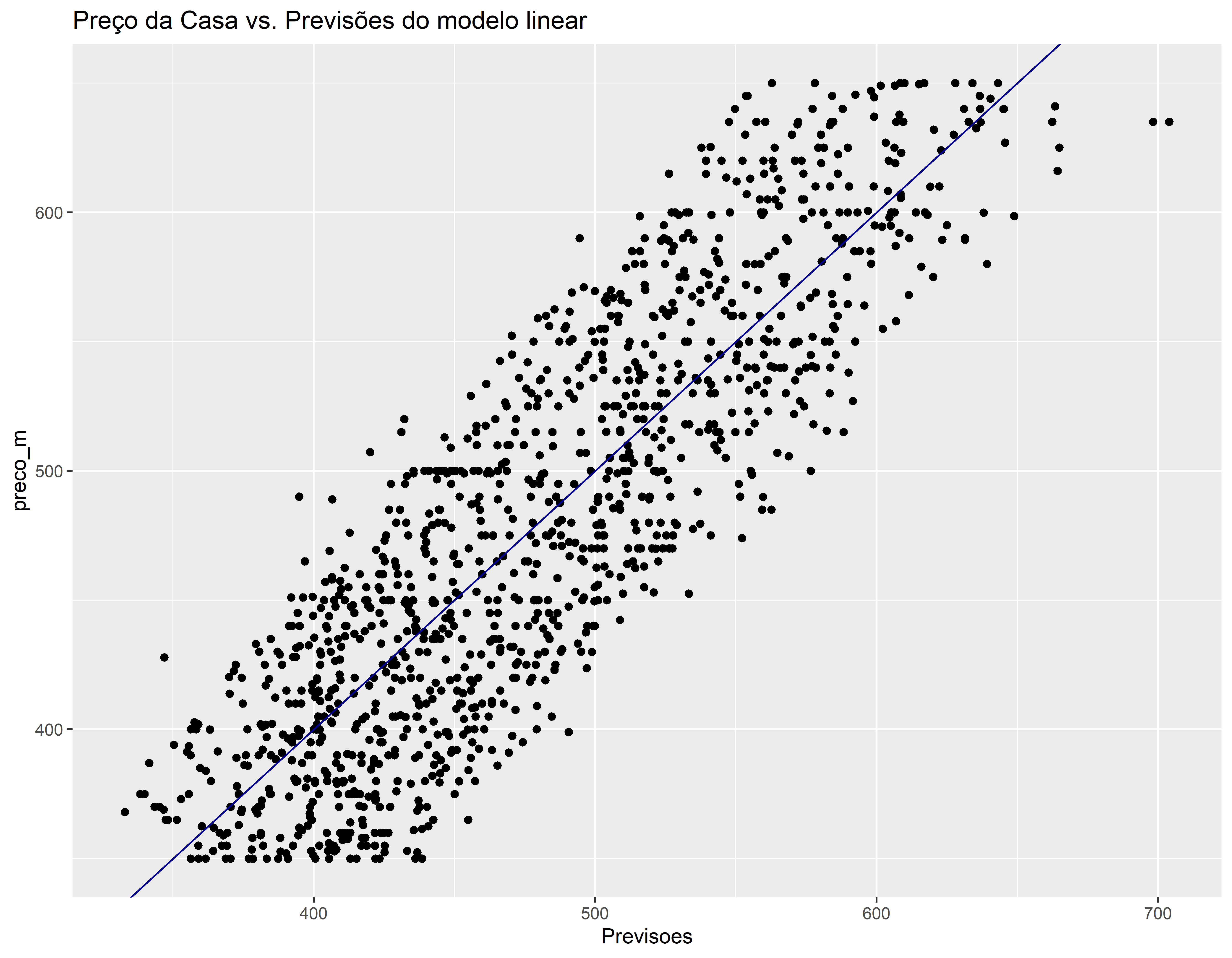 conj_treino$Previsoes<-predict(mod_bic, conj_treino)ggplot(conj_treino, aes(x=Previsoes, y=preco_m))+geom_point()+geom_abline(color ="darkblue")+ggtitle("Preço da Casa vs. Previsões do modelo linear")
