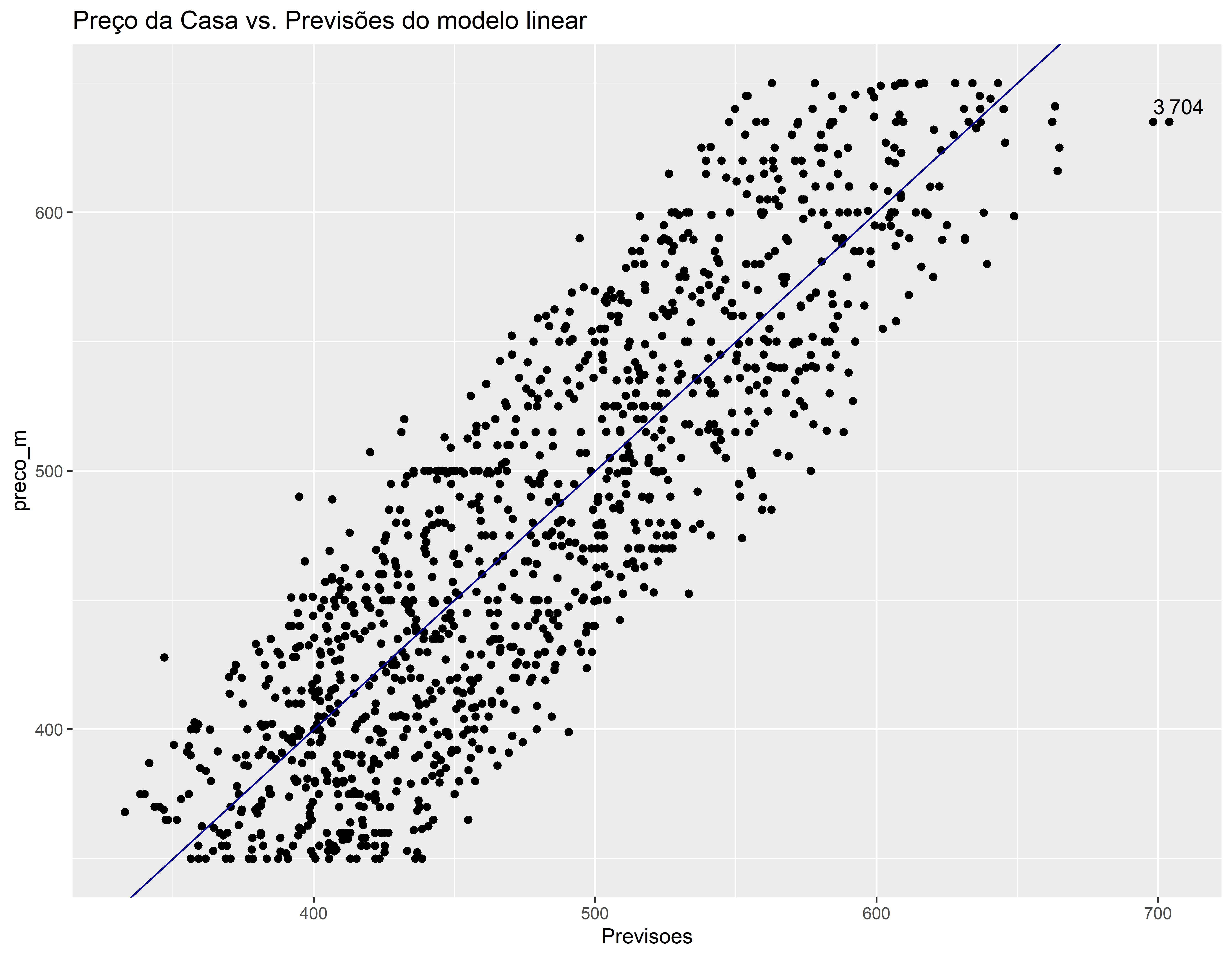 conj_treino$Previsoes<-predict(mod_bic, conj_treino)ggplot(conj_treino, aes(x=Previsoes, y=preco_m))+geom_point()+geom_abline(color ="darkblue")+ggtitle("Preço da Casa vs. Previsões do modelo linear")+geom_text(aes(label=ifelse(Previsoes>670, rownames(conj_treino), '')), hjust=0, vjust=-0.5)