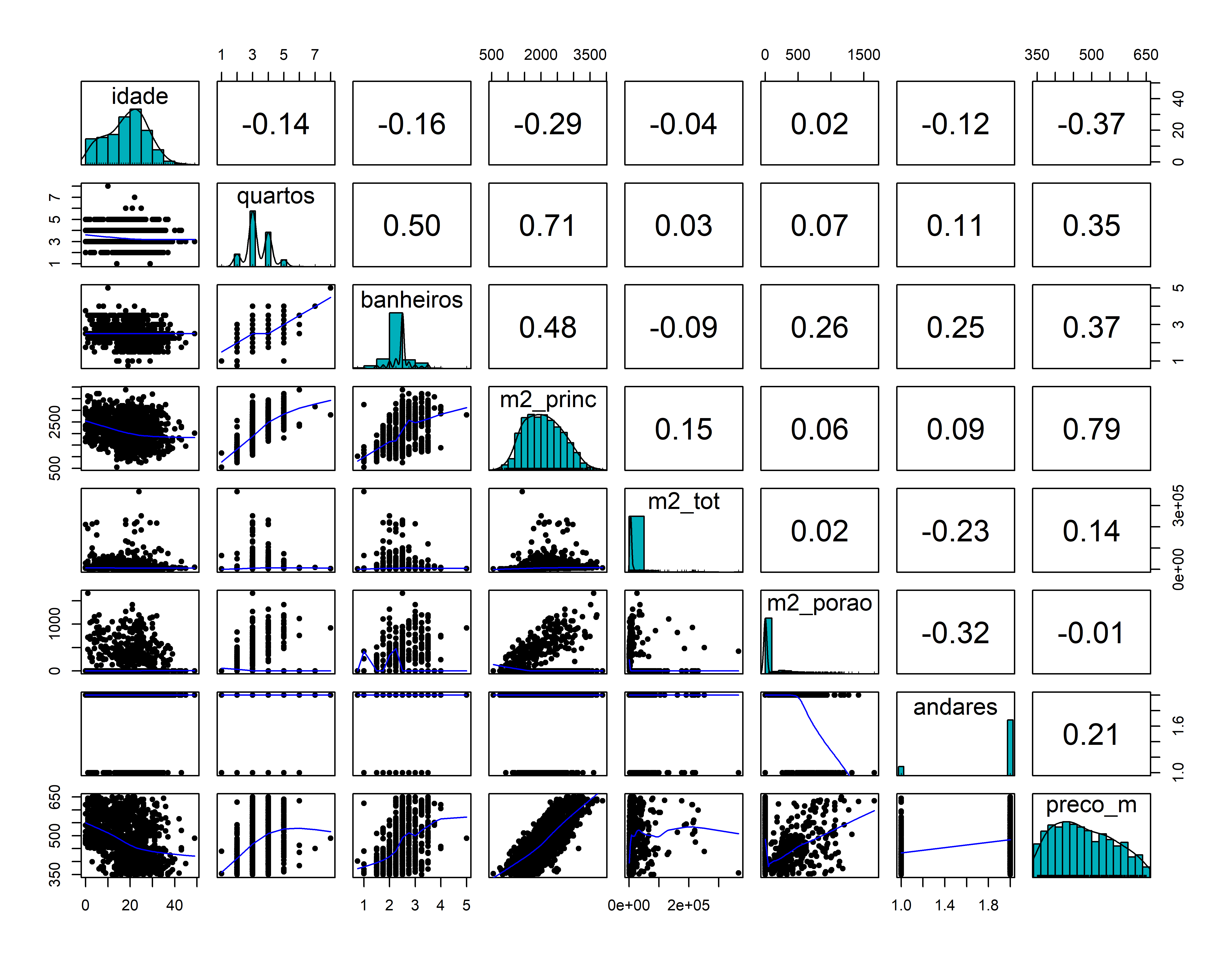 library(psych)pairs.panels(conj_treino, method ="pearson", # metodo de correlação hist.col ="#00AFBB", density =TRUE, # mostra graficos de densidade ellipses =FALSE# mostra elipses de correlação)